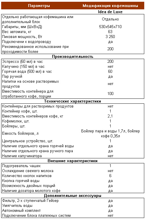 Idea De Luxe - автоматическая эспрессо кофемашина, работает на натуральном зерновом и на молотом кофе. Автомат отличается высокой надежностью, функциональностью, простотой в использовании и обслуживании. Модель оснащена отдельным краном подачи горячей воды и краном ручного пара.