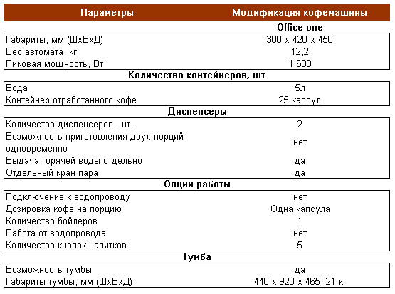 Кофемашина Office One Готовит настоящий кофе итальянский эспрессо, используя кофе, упакованный в капсулы. Также готовит кофе-ристретто, кофе-американо (большой кофе), снабжен краном выдачи горячей воды и пара для взбивания молока. Капсулы с кофе представляют собой герметично запакованные, контейнеры, гарантирующие сохранение свежести и несравнимый аромат свежемолотого кофе на несколько месяцев.